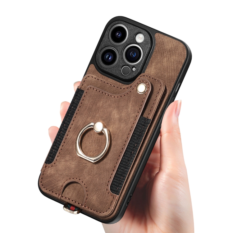 Funda para iPhone 12 Pro Retro Skin-Feel Ring Multi-Card Wallet (Marrón)