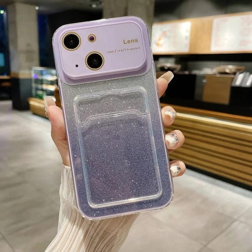 Estuche para teléfono iPhone 13 con brillo degradado y ventana grande con ranura para tarjeta (Púrpura Claro)