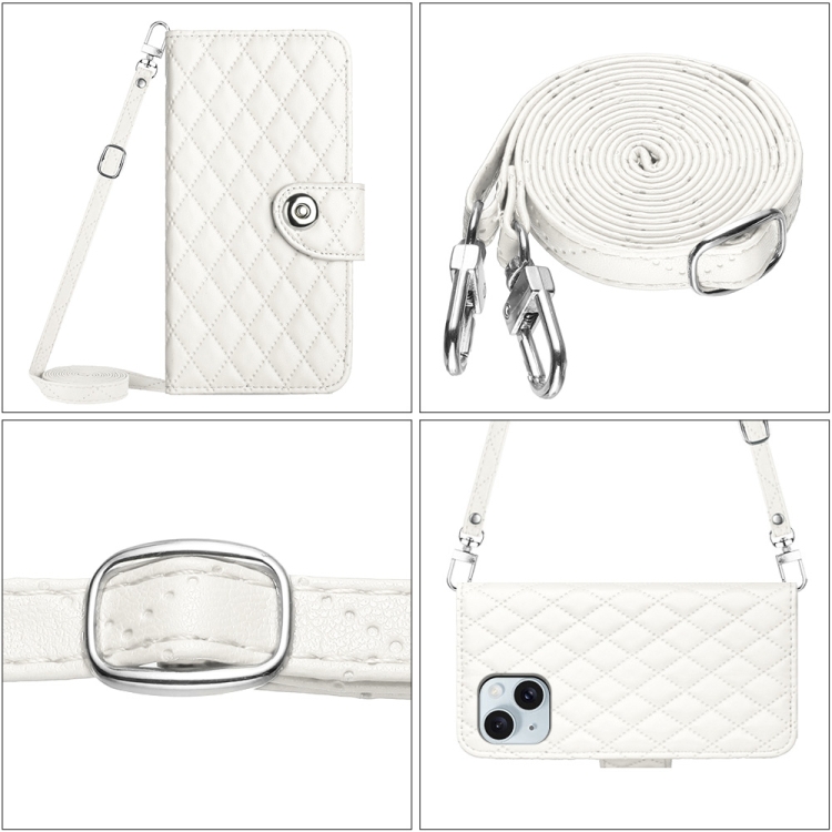 Funda de Cuero para iPhone 13 con Tapa Textura Rómbica y Cordón Largo (Blanco)