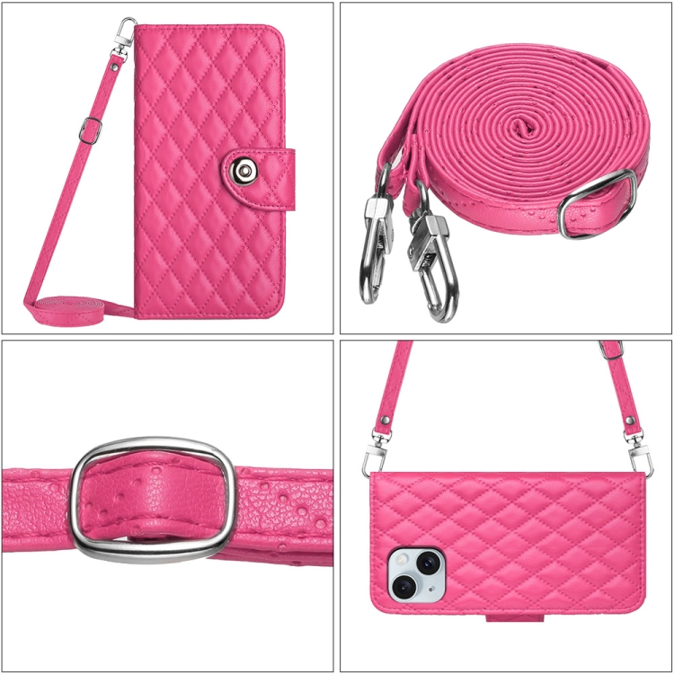 Funda para Teléfono iPhone 13 Cuero con Tapa Textura Rómbica y Cordón Largo (Rojo Rosa)