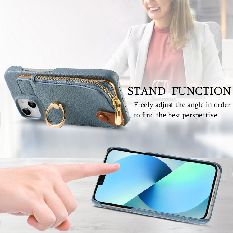 Funda Trasera para iPhone 13 con Billetera, Cremallera y Anillo de Cuero Litchi (Azul Claro)