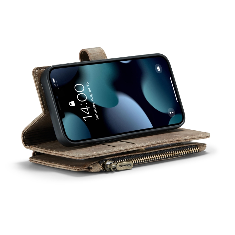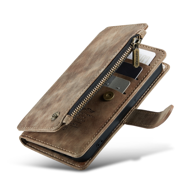 Funda para iPhone 13 Mini Caseme-C30 PU + TPU Cuero con Tapa Horizontal Multifuncional Soporte Ranura Tarjeta Billetera Bolsillo Cremallera (Marrón)