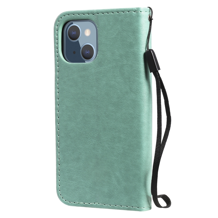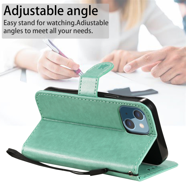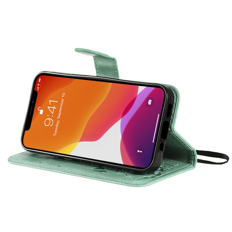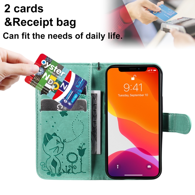 Funda de cuero para iPhone 13 Mini Cat Bee Patrón en relieve tapa horizontal soporte ranuras para tarjetas billetera (Verde)