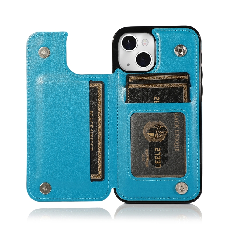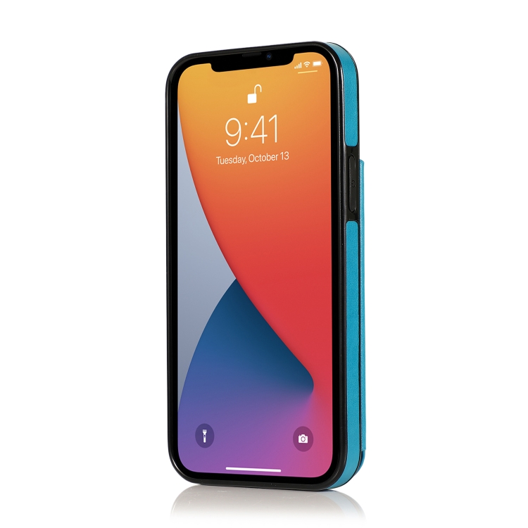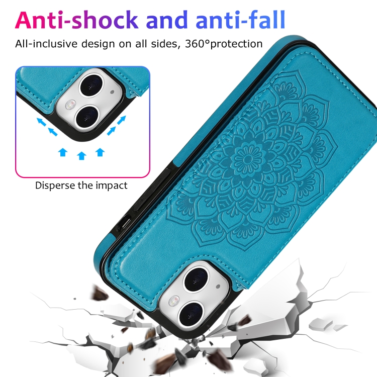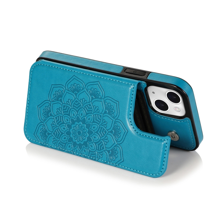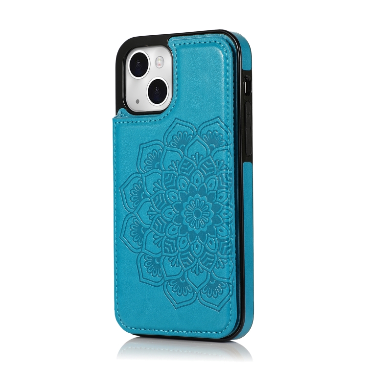 Funda Protectora iPhone 13 Mini Doble Hebilla Patrón Mandala Pu + TPU Ranuras Tarjetas Soporte Marco Fotos (Azul)