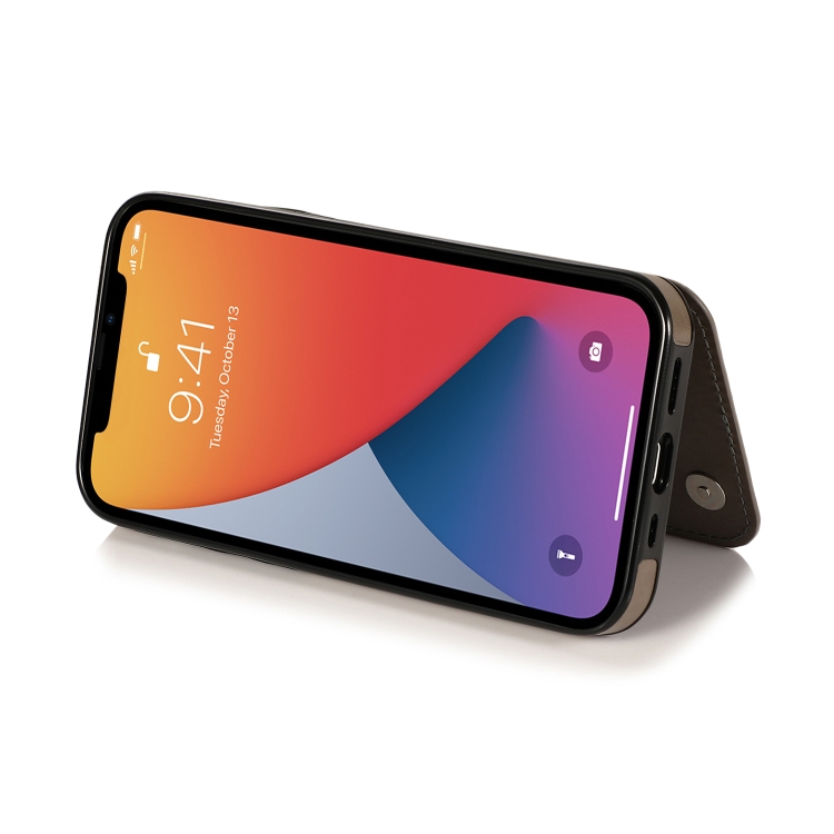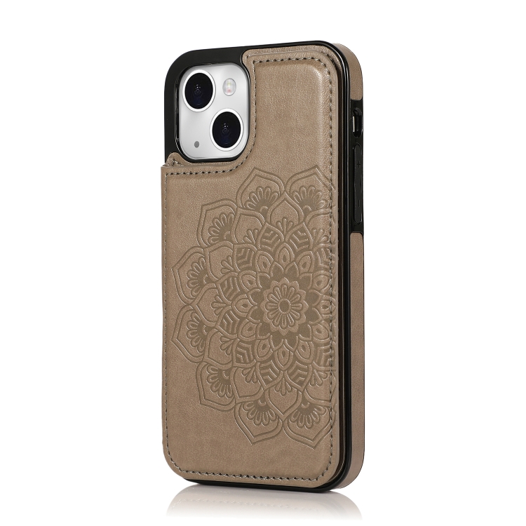 Funda Protectora iPhone 13 Mini Doble Hebilla Patrón Mandala PU TPU Ranuras Tarjetas Soporte Marco Fotos (Gris)