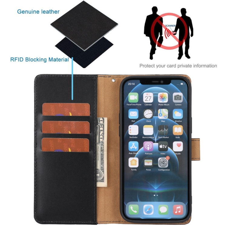 Funda de teléfono iPhone 13 Mini Cuero Genuino Piel de Vaca Tejido Liso (Negro)
