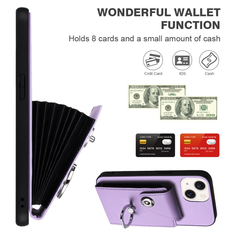 Funda para Teléfono iPhone 13 Mini PU con Soporte para Anillo y Bolsa para Tarjeta con Cordón (Púrpura)