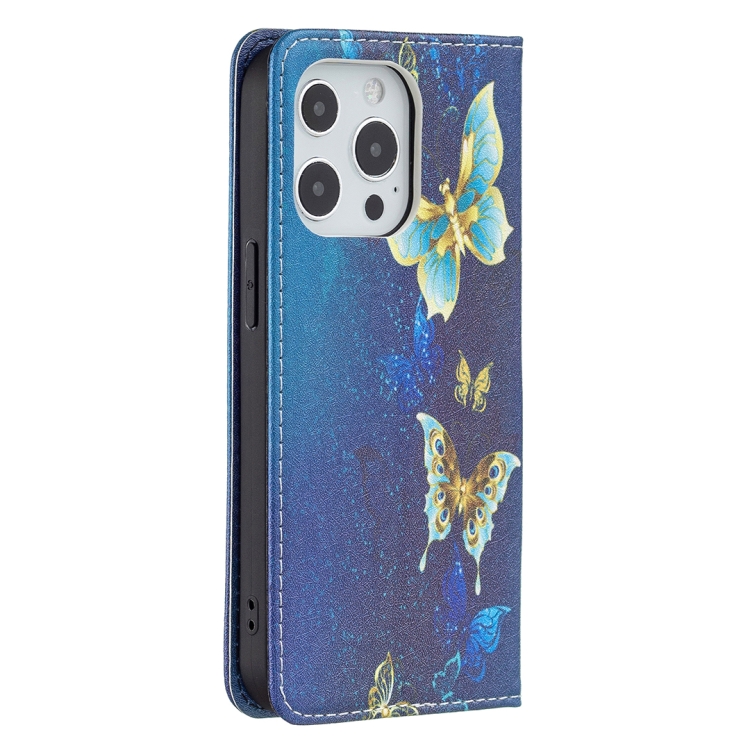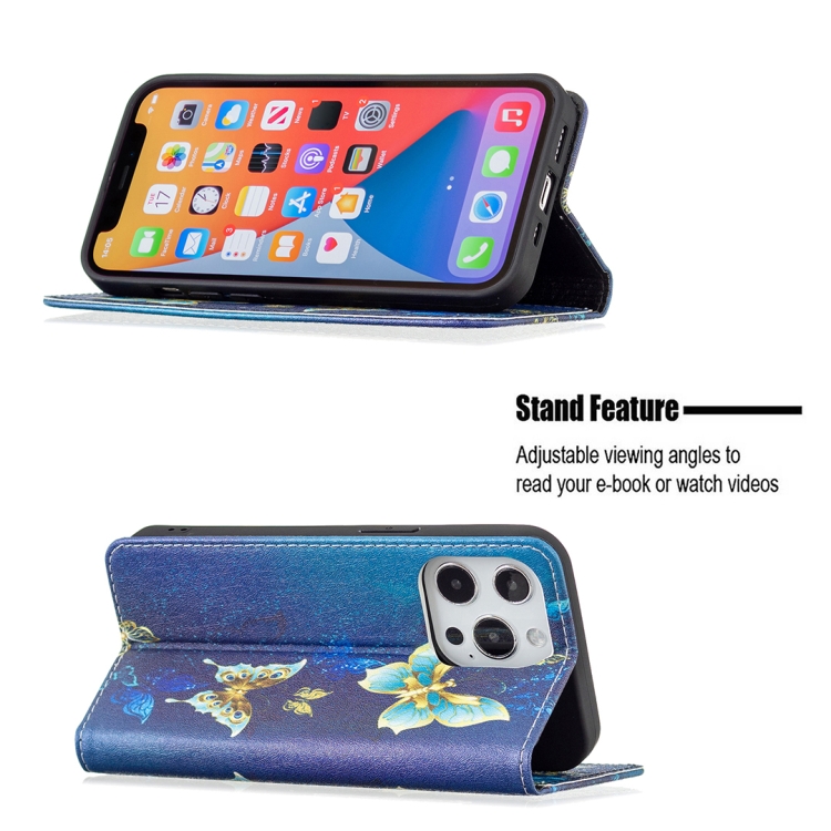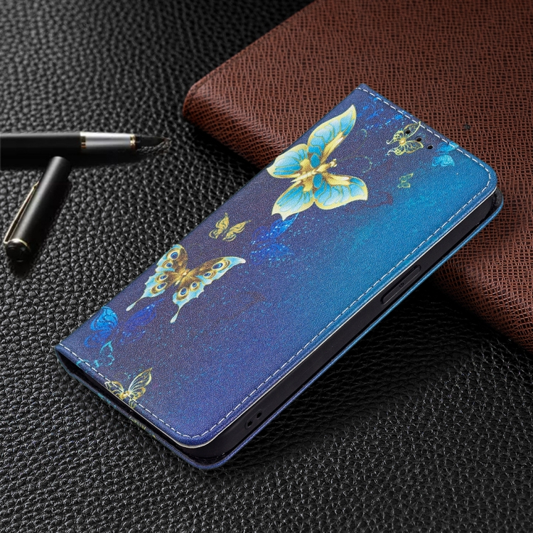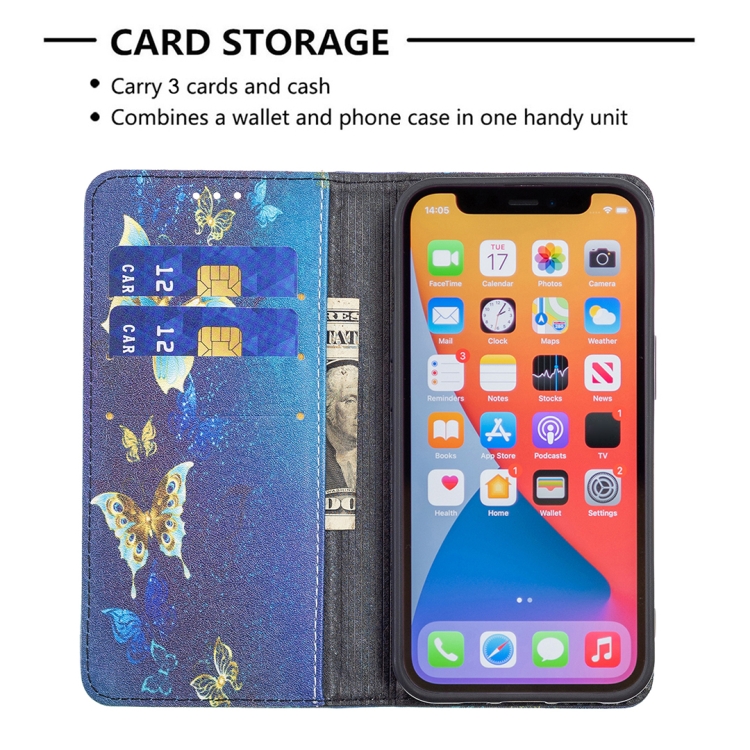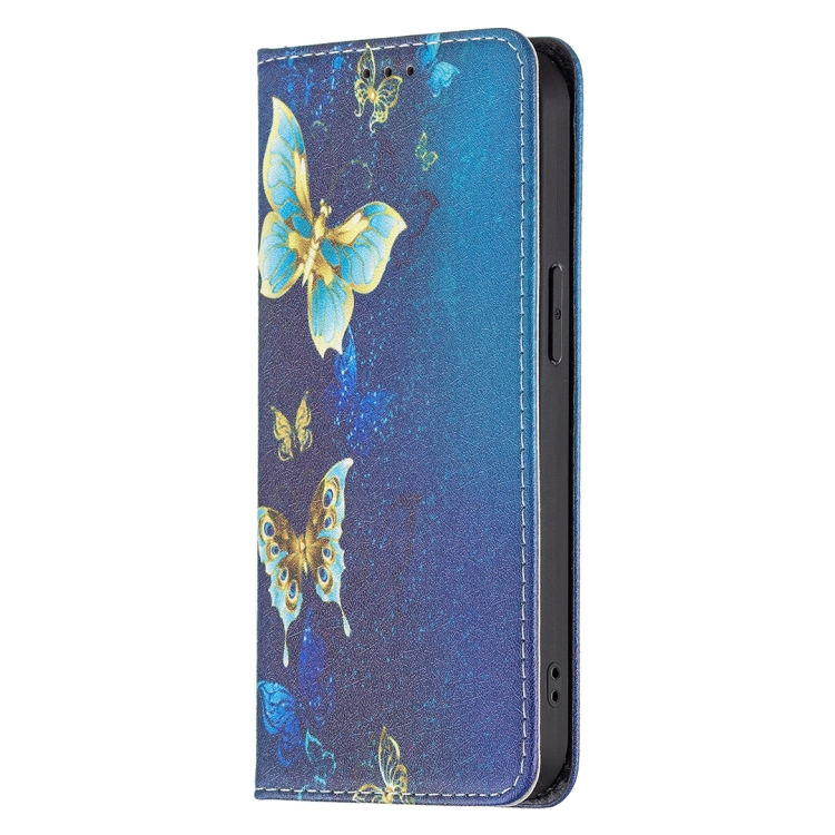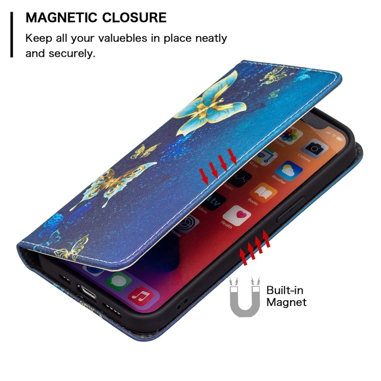 Estuche de Cuero PU para iPhone 13 Mini con Tapa Magnética Horizontal Soporte y Ranuras para Tarjetas (Mariposas Doradas)