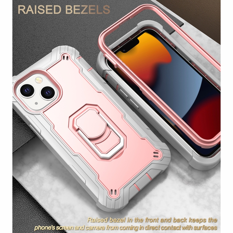 Funda Protectora para iPhone 13 Mini PC y Goma 3 Capas a Prueba de Golpes con Soporte Giratorio (Gris Blanco + Oro Rosa)