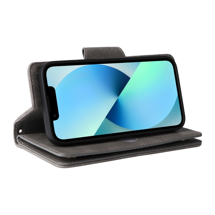 Funda de Cuero para Teléfono iPhone 13 Mini Rivet Buckle 9 Cards Tres Pliegues (Gris)