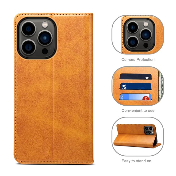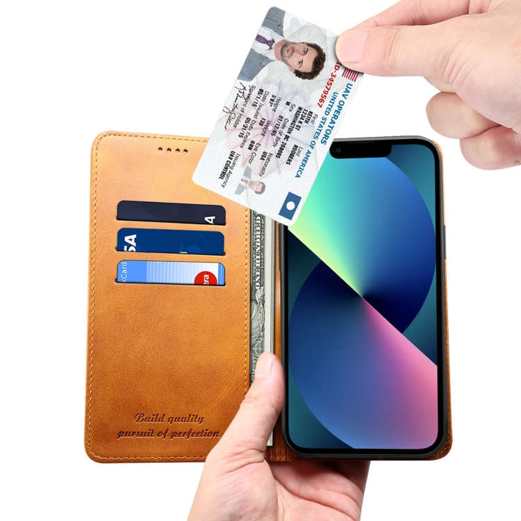 Funda de Cuero para iPhone 13 Pro Calf Texture con Tapa Horizontal, Soporte y Ranuras para Tarjetas (Caqui)