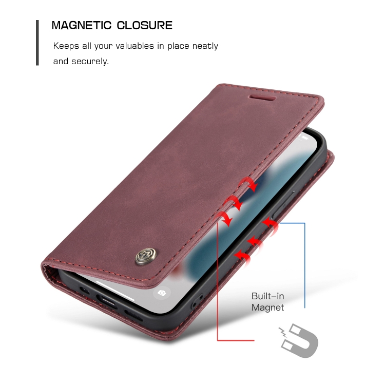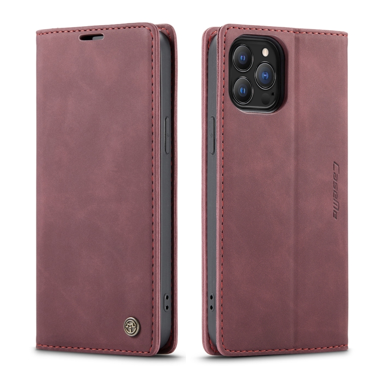 Funda para iPhone 13 Pro Caseme-013 Cuero Tapa Horizontal Esmerilada Multifuncional Ranura Tarjeta Soporte Billetera (Rojo Vino)