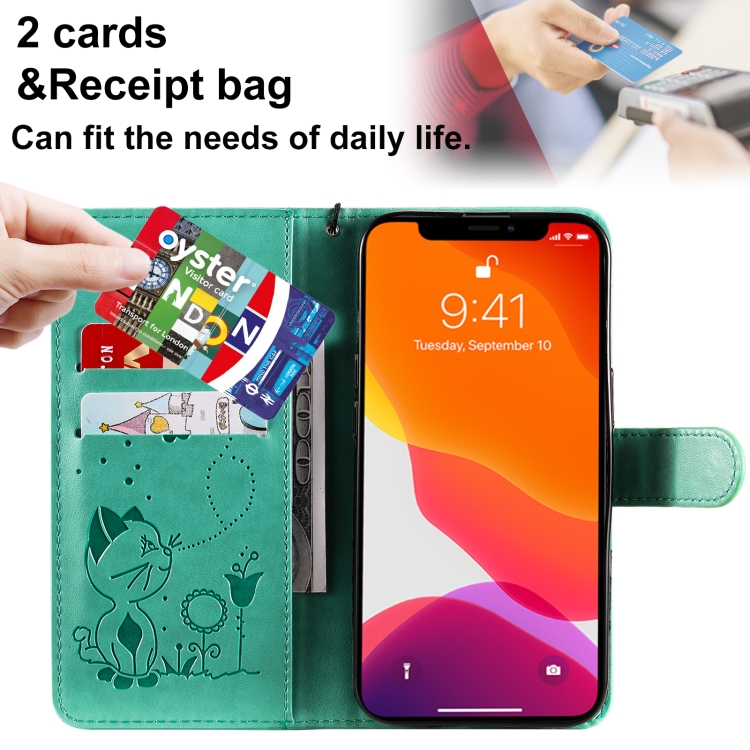 Funda de Cuero iPhone 13 Pro Cat Bee Patrón En Relieve con Tapa Horizontal Soporte Ranuras Tarjetas Billetera (Verde)