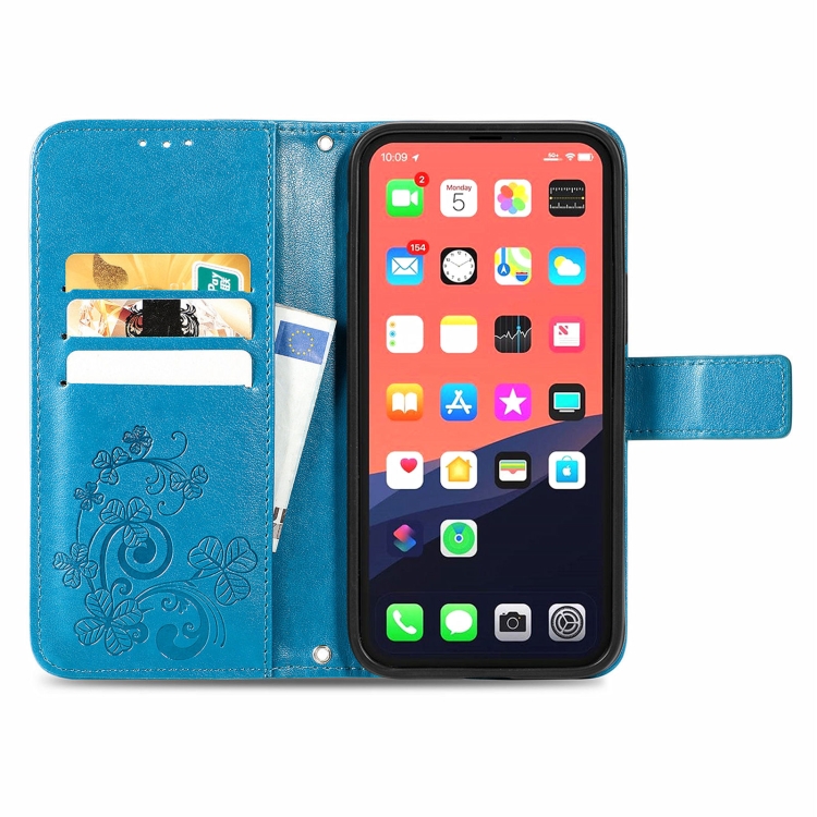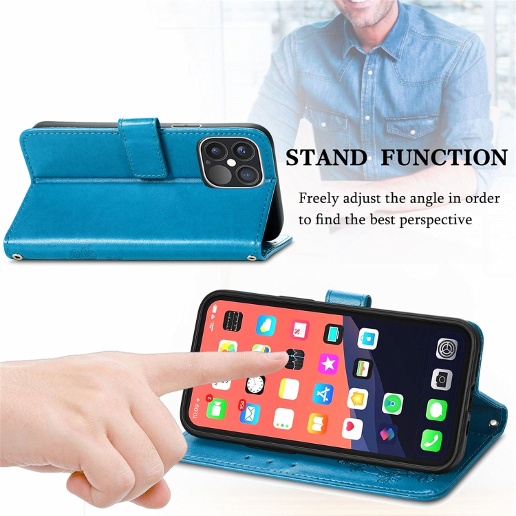 Funda de Cuero para iPhone 13 Pro Cierre de Trébol Hebilla En Relieve con Ranura para Tarjeta y Soporte (Azul)