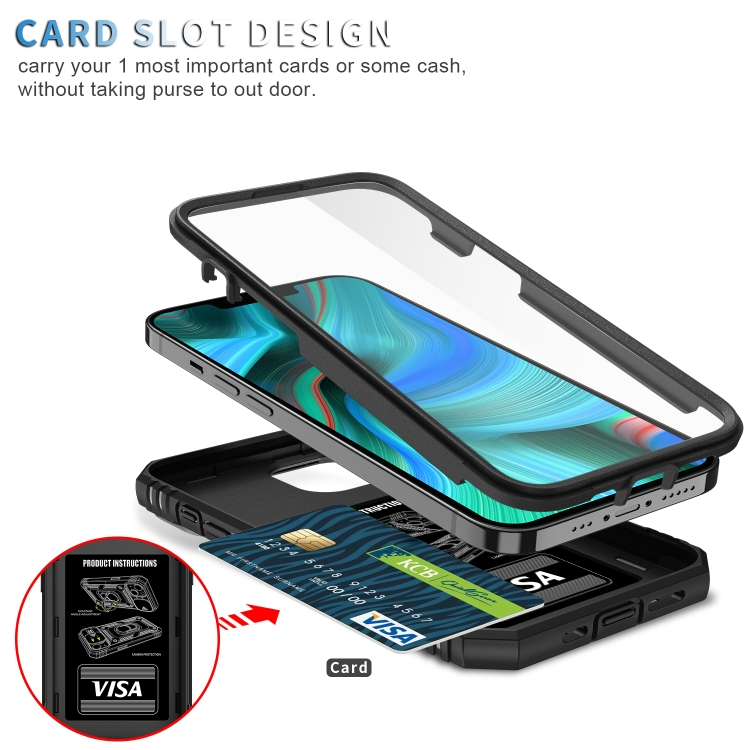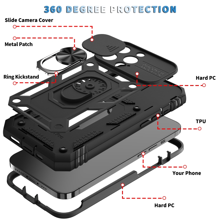 Funda Protectora para iPhone 13 Pro TPU + PC con Cubierta de Cámara Deslizante Soporte Giratorio 360 Ranura para Tarjeta (Negro)
