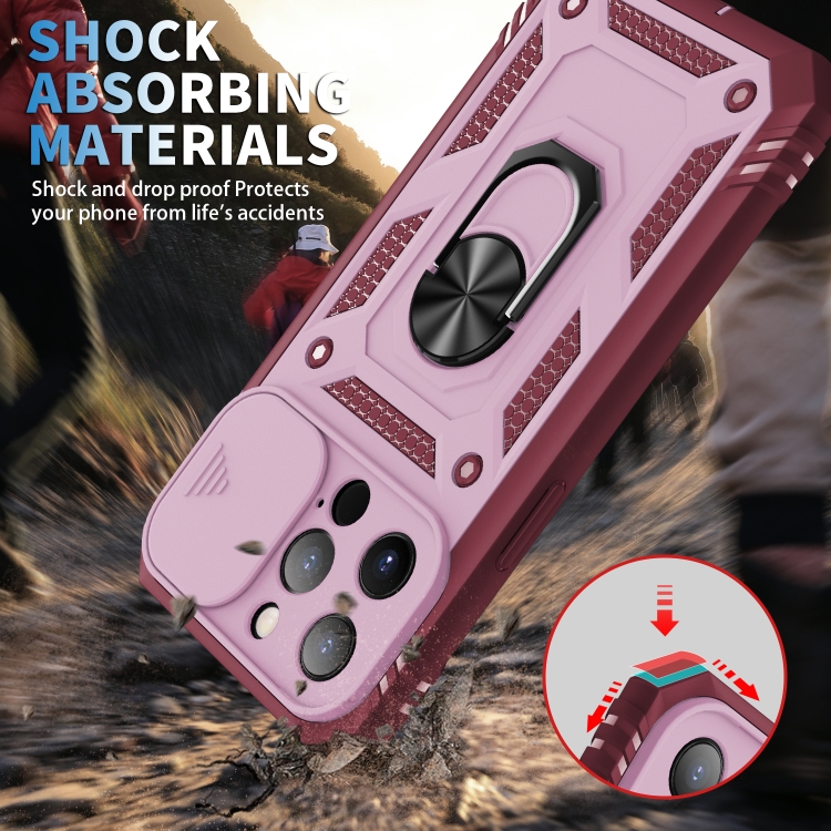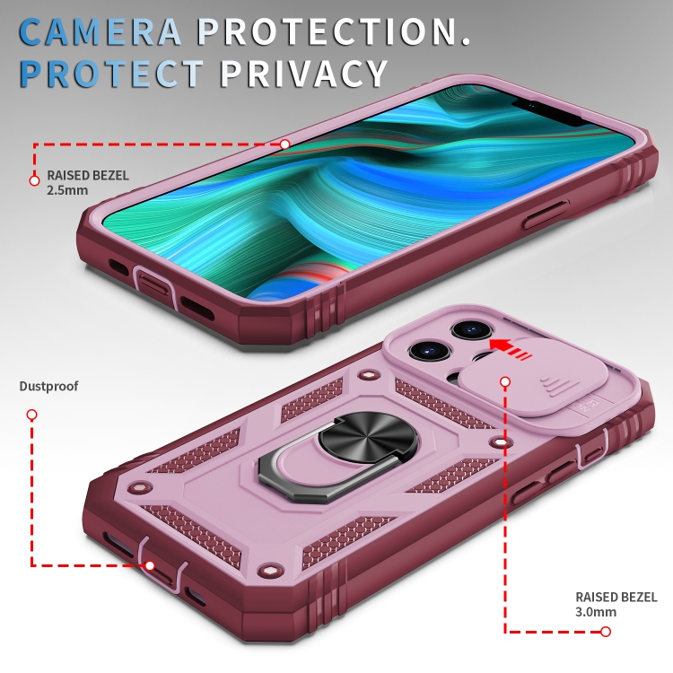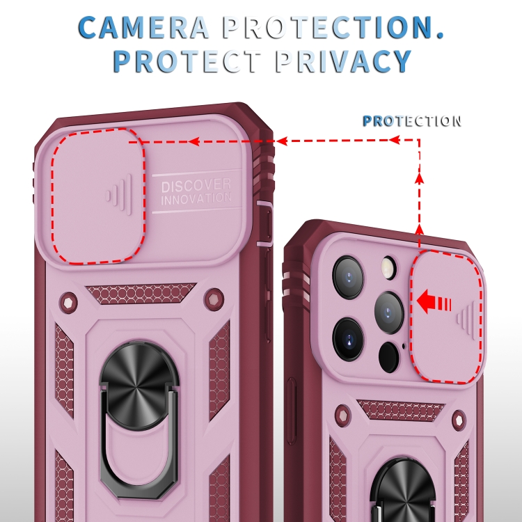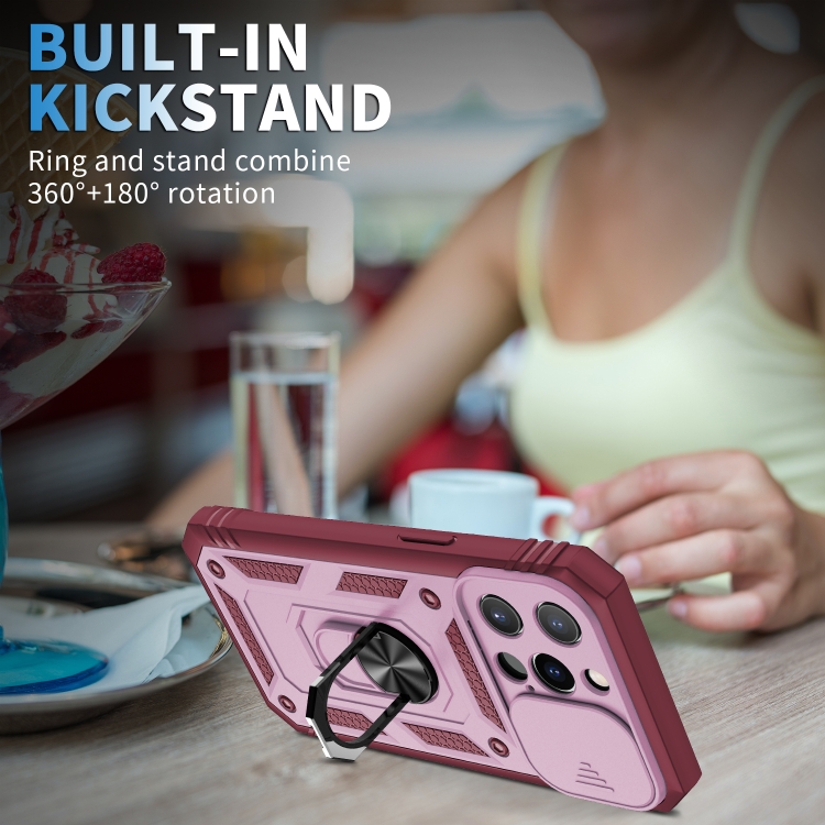 Funda protectora para iPhone 13 Pro TPU + PC con cubierta de cámara deslizante soporte giratorio 360 grados ranura para tarjeta (Rosa + Rojo oscuro)