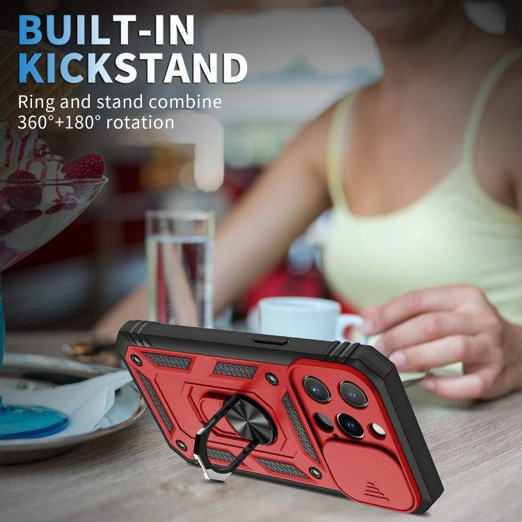 Funda Protectora para iPhone 13 Pro TPU + PC con Cubierta de Cámara Deslizante Soporte Giratorio 360 y Ranura para Tarjeta (Rojo + Negro)