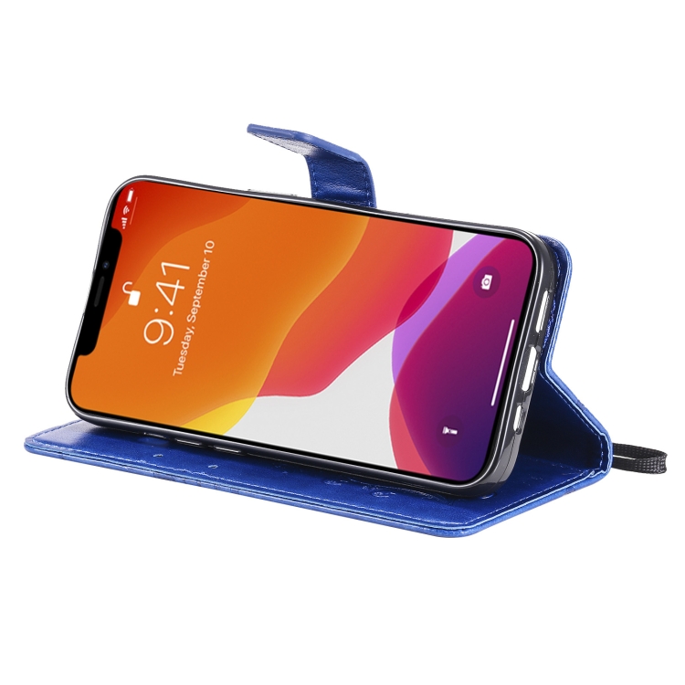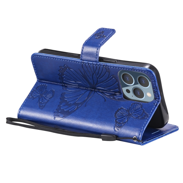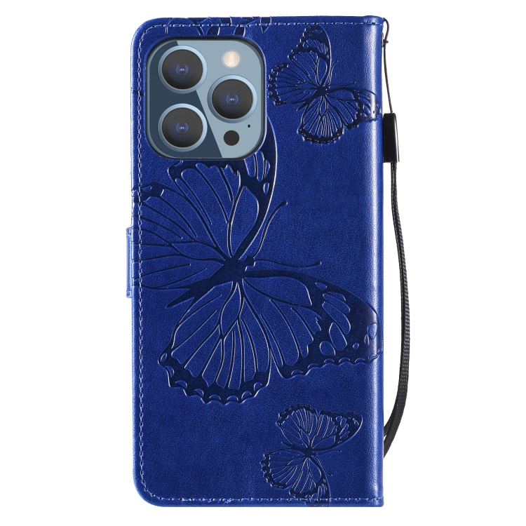 Estuche de Cuero iPhone 13 Pro Tapa Horizontal Patrón Mariposa 3D Soporte Ranura Tarjeta Billetera Cordón (Azul)