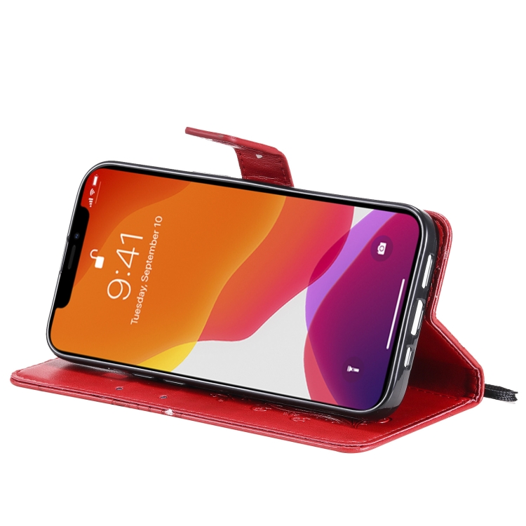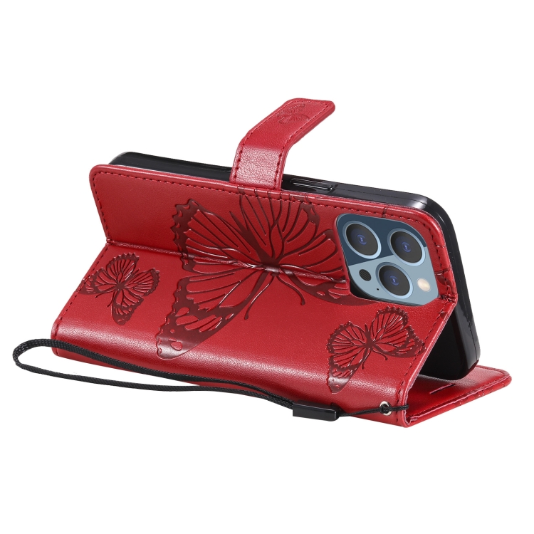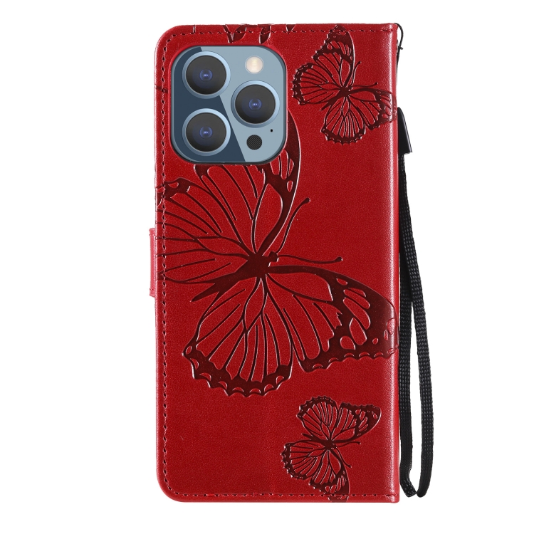 Estuche de Cuero para iPhone 13 Pro con Tapa Horizontal, Patrón Mariposa 3D, Soporte, Ranura para Tarjeta, Billetera y Cordón (Rojo)