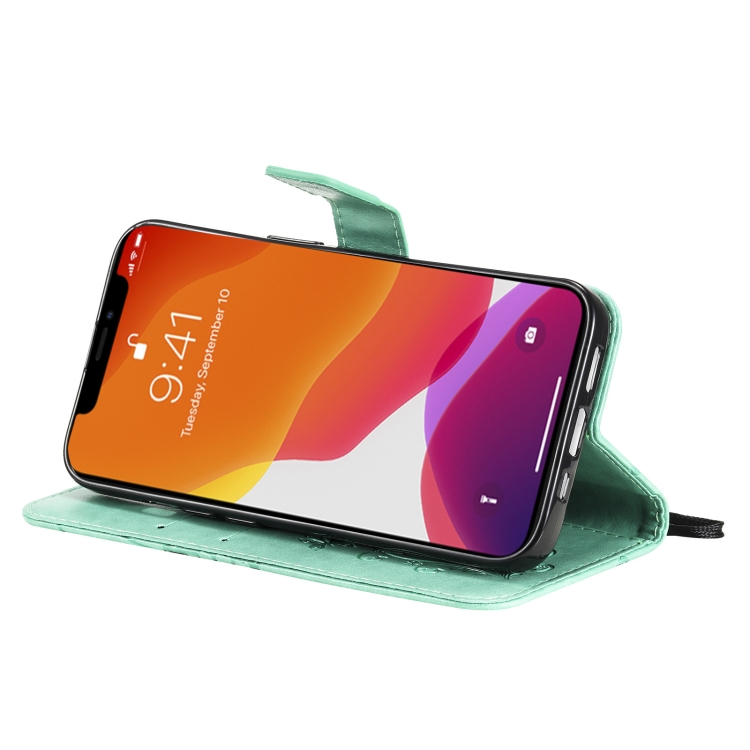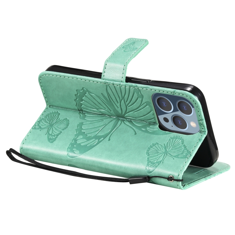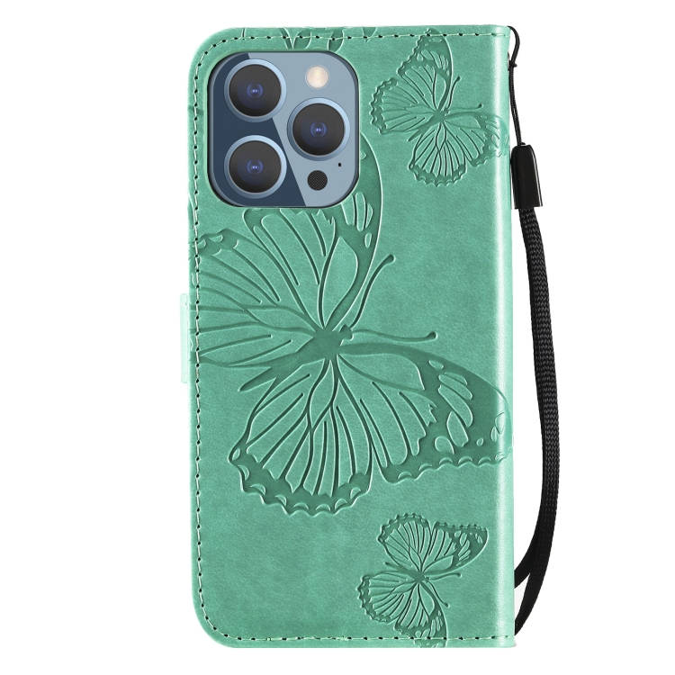 Estuche de Cuero para iPhone 13 Pro con Tapa Horizontal Patrón Mariposa 3D Soporte Ranura Tarjeta Billetera Cordón (Verde)