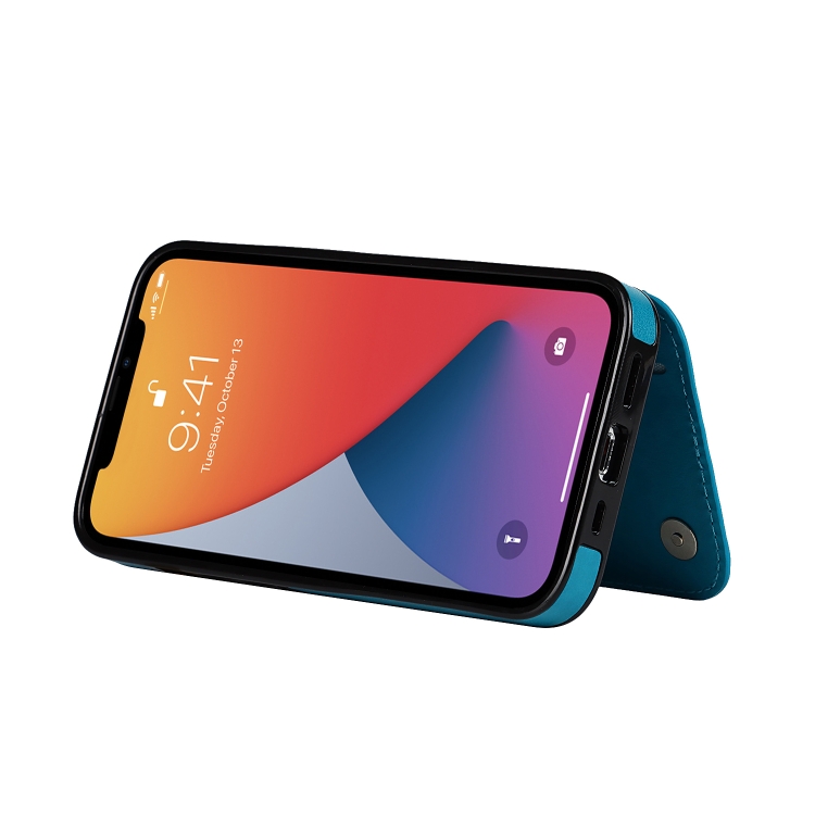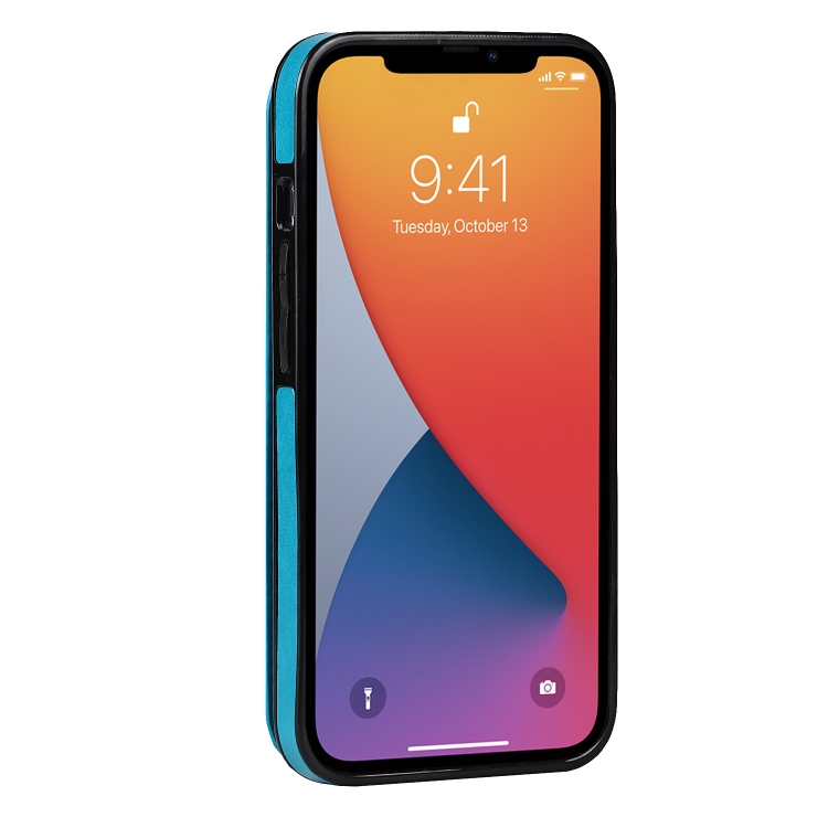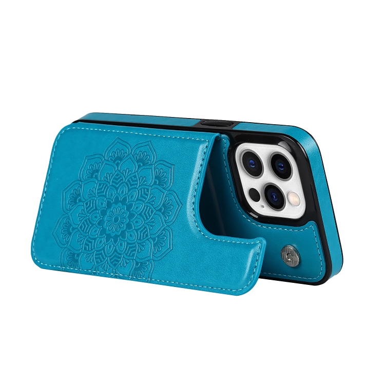 Estuche trasero de cuero iPhone 13 Pro doble hebilla mandala ranuras tarjetas soporte marco fotos (Azul)