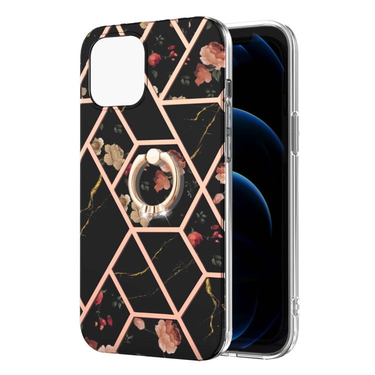Funda para iPhone 13 Pro TPU Galvanoplastia Patrón de Flores Mármol Soporte Anillo Diamantes (Flor Negra)