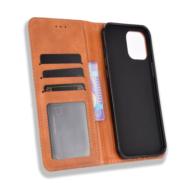 Funda de Cuero para iPhone 13 Pro Hebilla Magnética Patrón Retro con Tapa Horizontal Soporte Ranura para Tarjeta Billetera (Marrón)