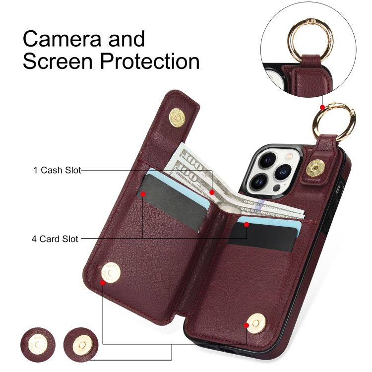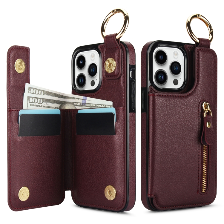 Funda para teléfono iPhone 13 Pro Litchi Texture Zipper con bolsa para tarjetas y doble hebilla (Rojo Granate)