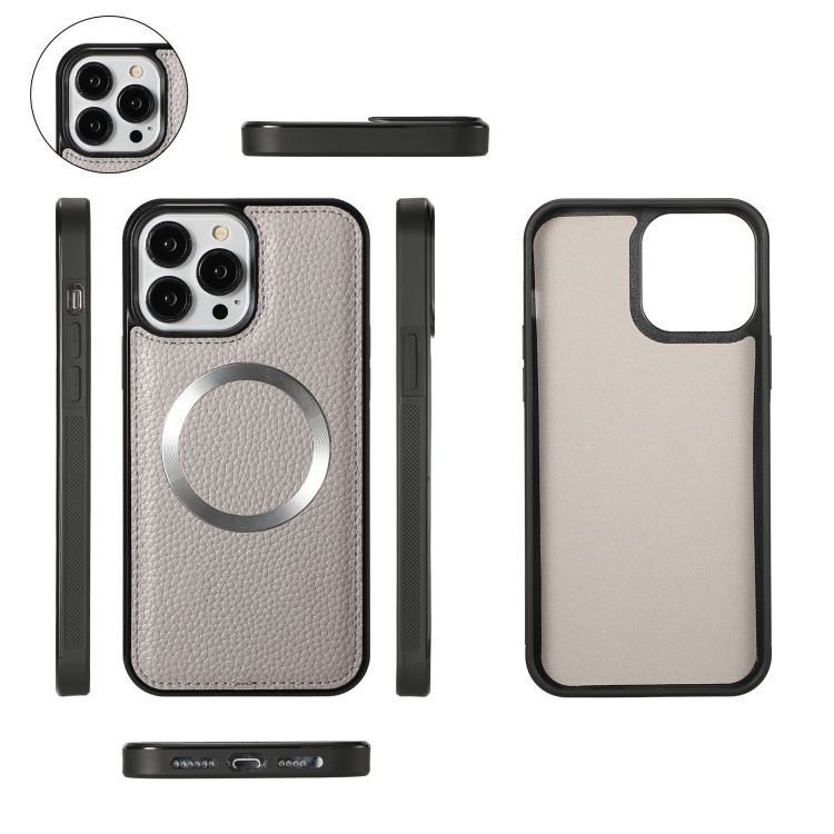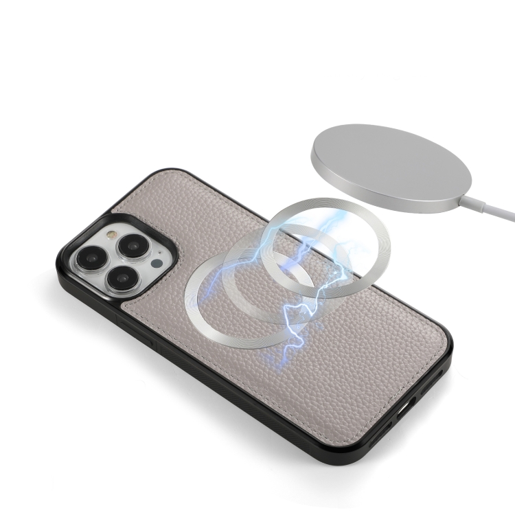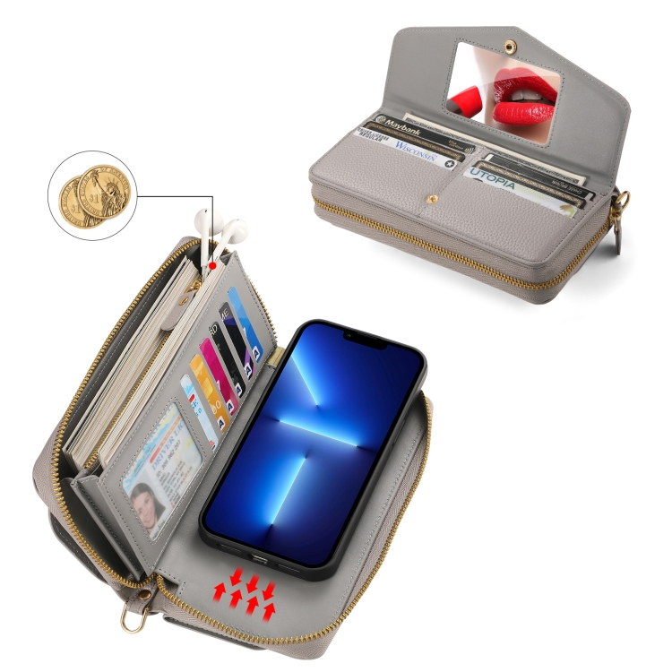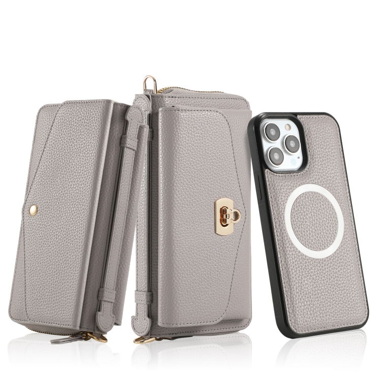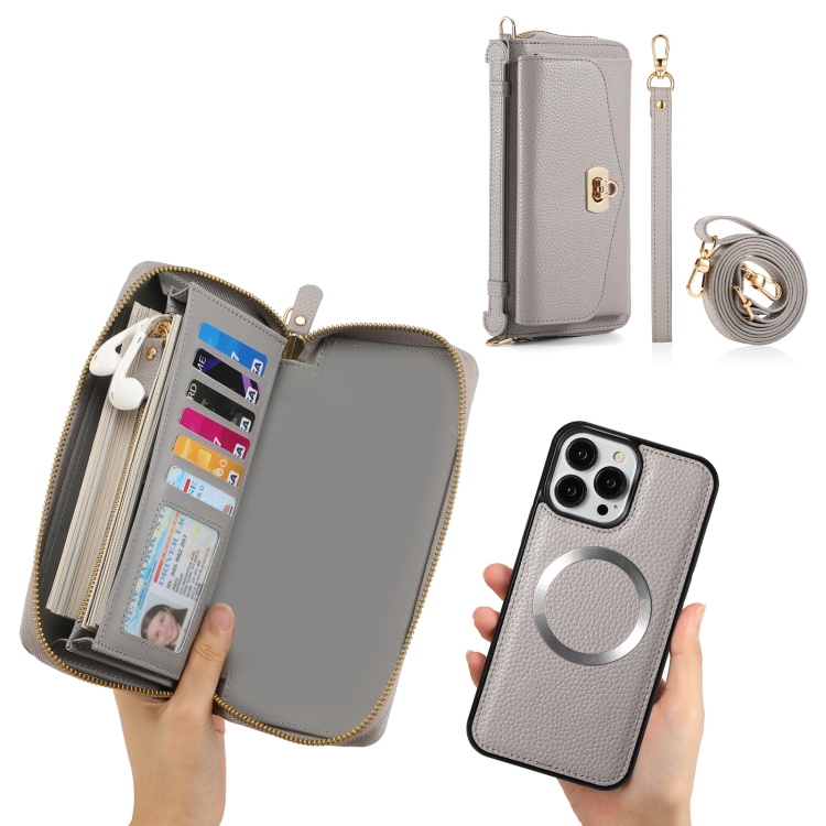 Funda para Teléfono iPhone 13 Pro Magsafe Crossbody Cartera Multifuncional con Cremallera Cuero Litchi (Gris)