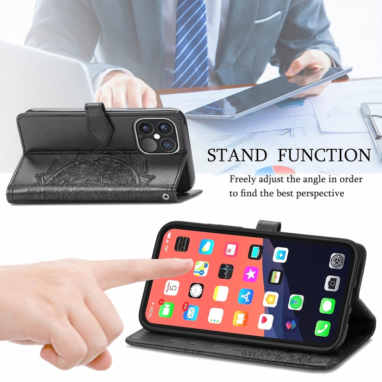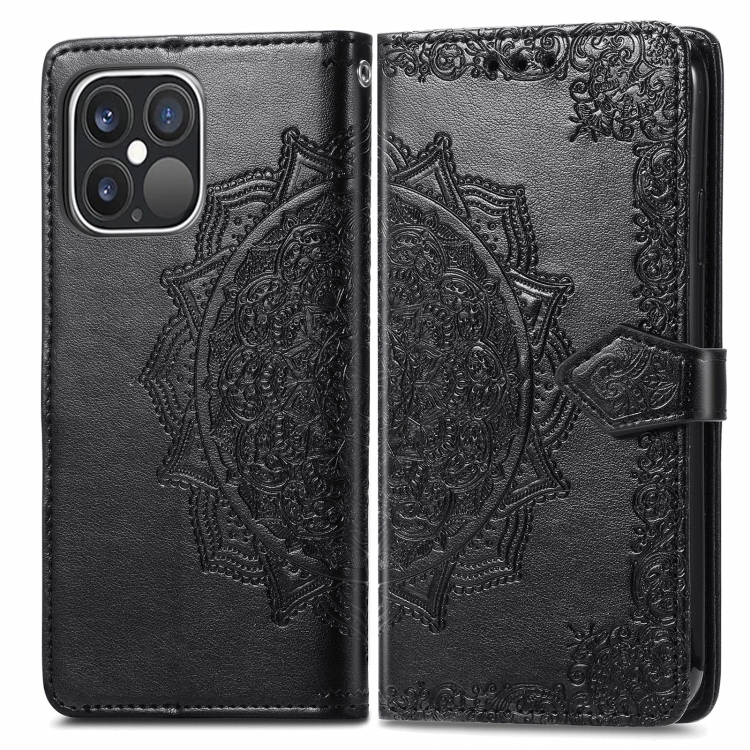 Estuche de Cuero iPhone 13 Pro Mandala Flower con Tapa Horizontal En Relieve Soporte Tres Ranuras Billetera y Cordón (Negro)