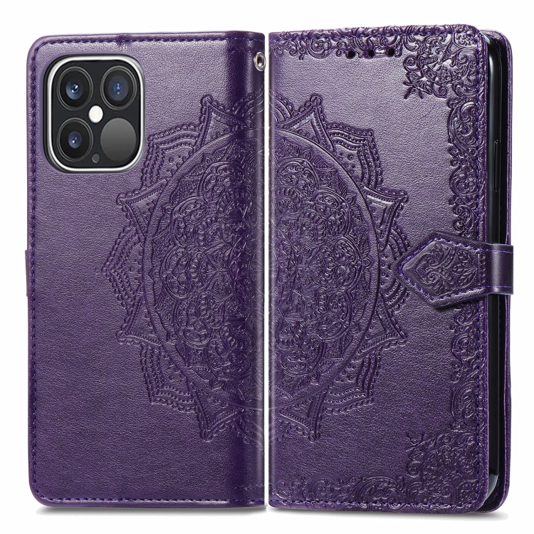 Estuche de Cuero para iPhone 13 Pro Mandala Flower con Tapa Horizontal en Relieve Soporte y Ranuras para Tarjetas y Billetera (Púrpura)