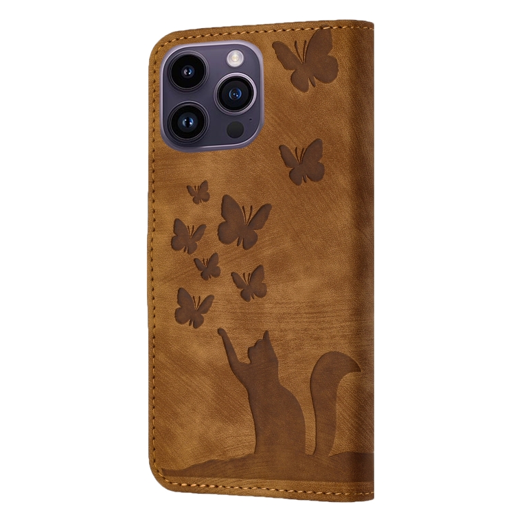 Funda para iPhone 13 Pro Max Butterfly Cat de Cuero con Tapa en Relieve (Marrón)