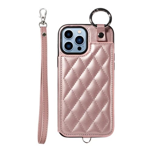 Estuche para Teléfono iPhone 13 Pro Max con Bolsa para Tarjetas Textura Rómbica y Cordón Corto (Oro Rosa)