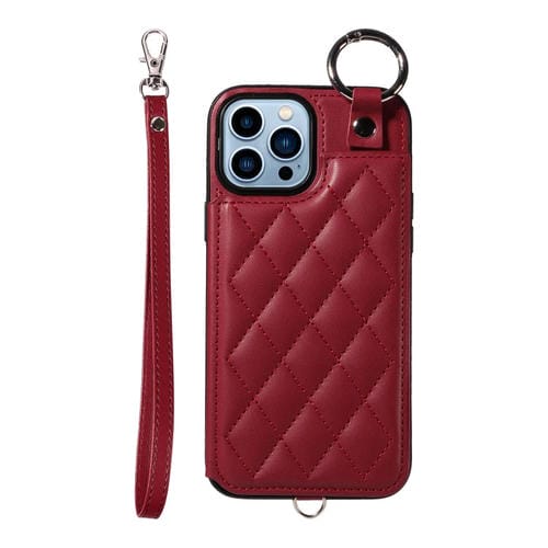 Estuche para Teléfono iPhone 13 Pro Max con Bolsa para Tarjetas Textura Rómbica y Cordón Corto (Rojo Vino)