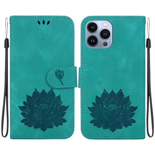 Funda de Cuero para iPhone 13 Pro Max con Relieve de Loto (Verde)