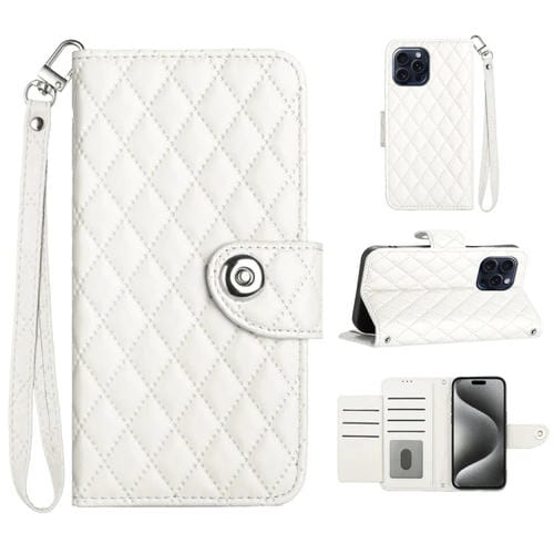 Funda para Teléfono iPhone 13 Pro Max con Tapa de Cuero Textura Rómbica y Cordón (Blanco)