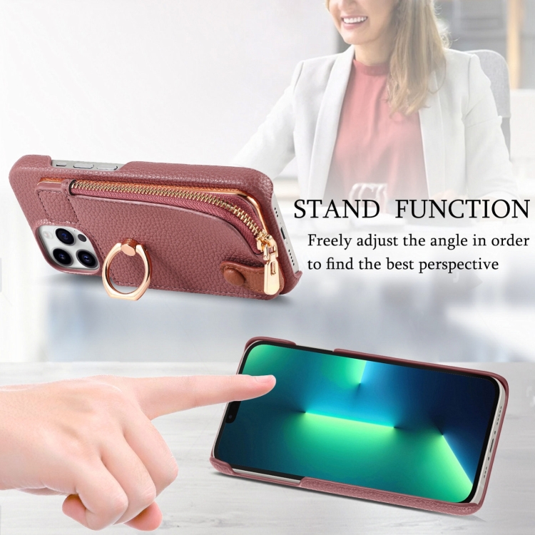 Funda Trasera para iPhone 13 Pro Max con Billetera, Cremallera y Anillo de Cuero Litchi (Albaricoque Azufaifo)