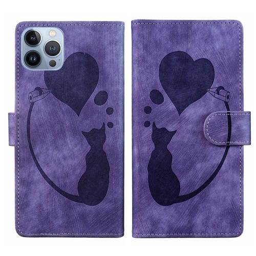 Funda de Cuero para iPhone 13 Pro Max Pen Heart Cat En Relieve (Púrpura)