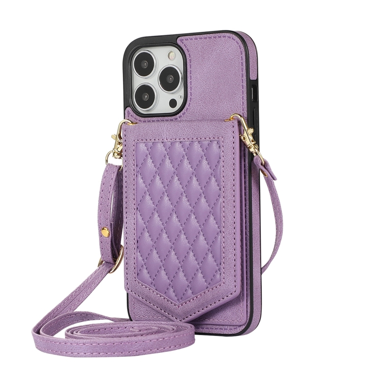 Funda para iPhone 13 Pro Rhombic Texture Rfid con Cordón y Espejo (Púrpura)