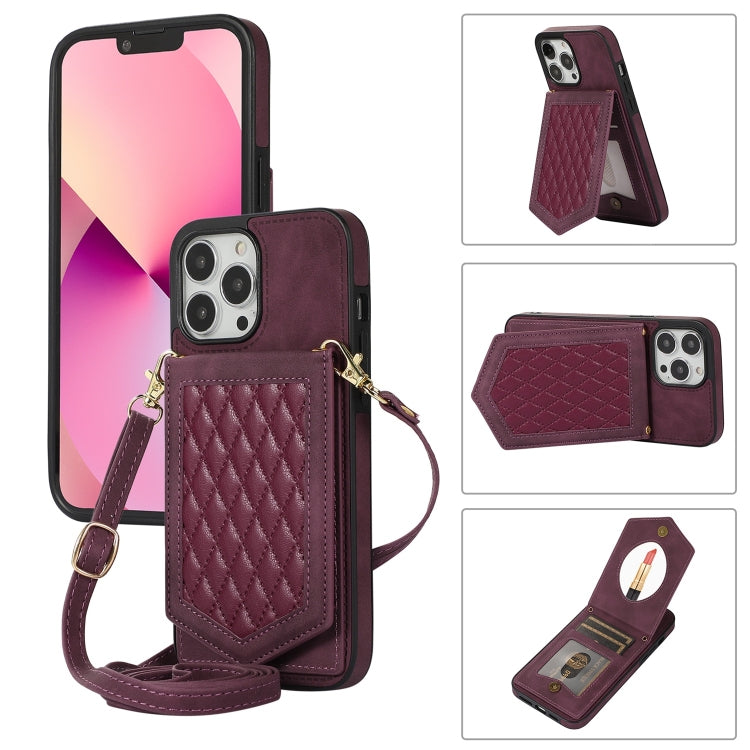 Funda para iPhone 13 Pro Rhombic Texture Rfid con Cordón y Espejo (Rojo Vino)