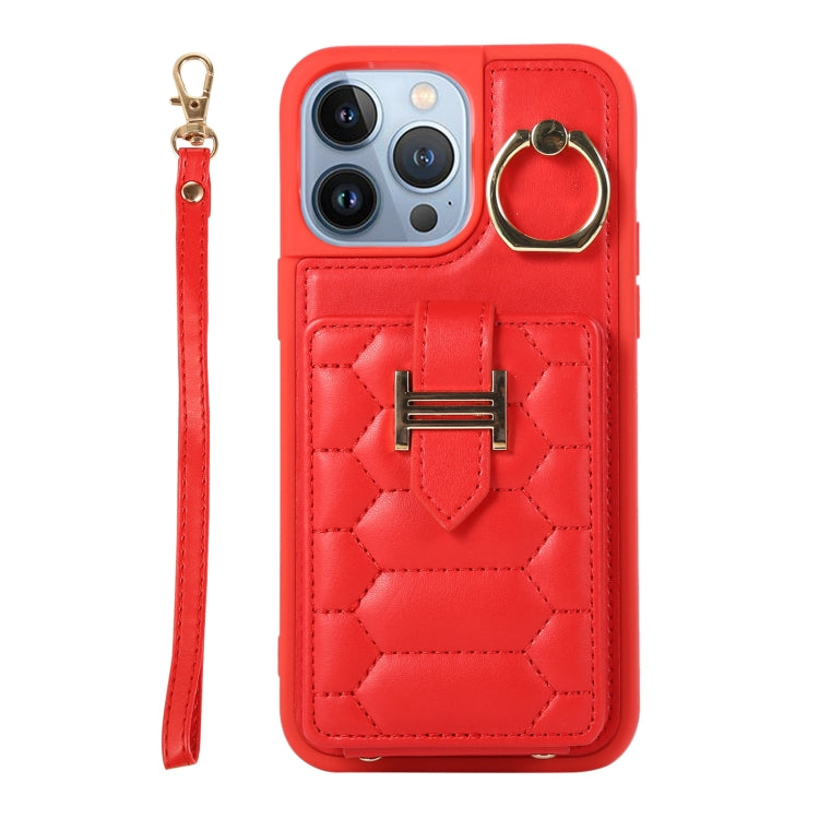 Funda para iPhone 13 Pro Vertical Card Bag Ring Holder con Doble Cordón (Rojo)