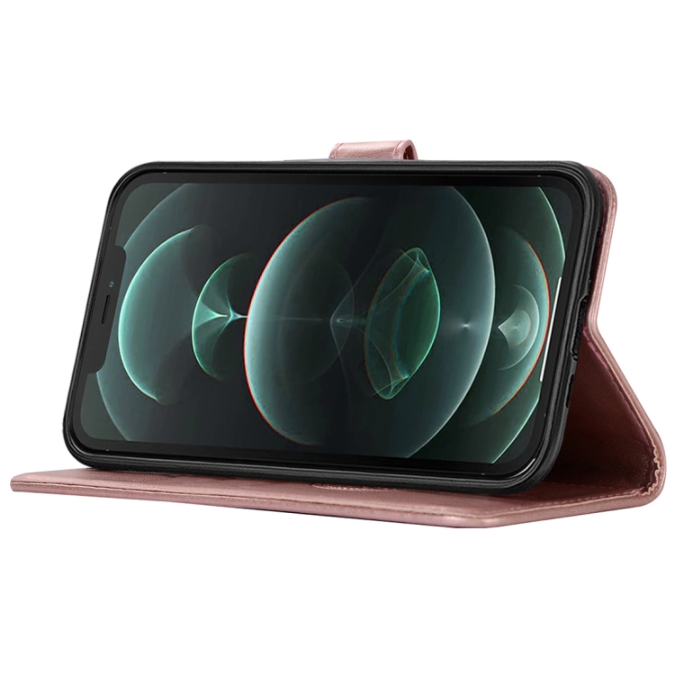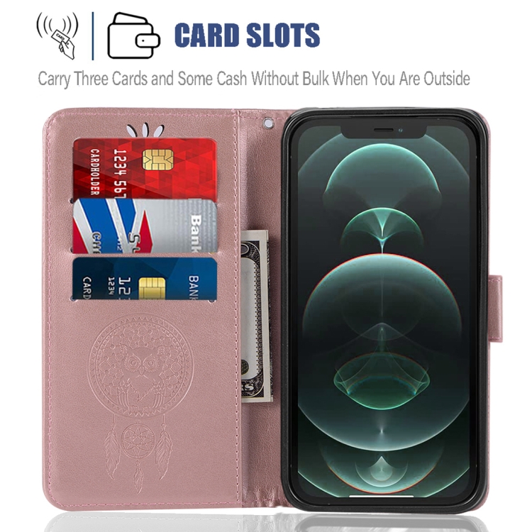 Funda de Cuero para iPhone 13 Pro Wind Chime Owl Patrón En Relieve con Tapa Horizontal Soporte y Ranuras para Tarjetas (Oro Rosa)