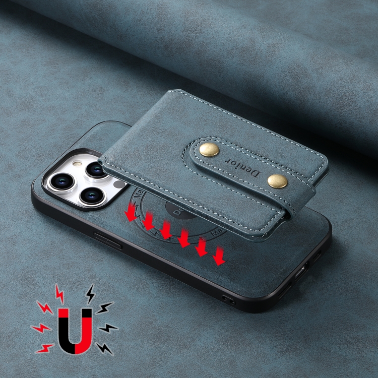 Estuche de Cuero Denior D14 Nk para iPhone 14/13 con Tarjetero Magnético Magsafe y Patrón Retro (Azul)