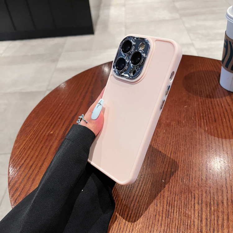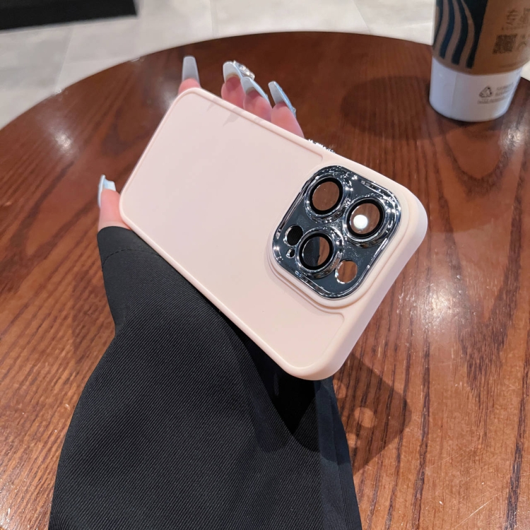 Caja de Teléfono para iPhone 14 con Marco de Lente Galvanizada y Película de Lente (Rosa Claro)