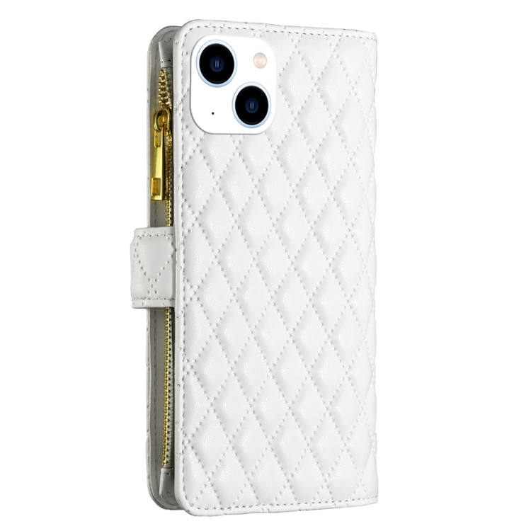 Funda para iPhone 14 Diamond Lattice Zipper Wallet de Cuero con Tapa (Blanco)