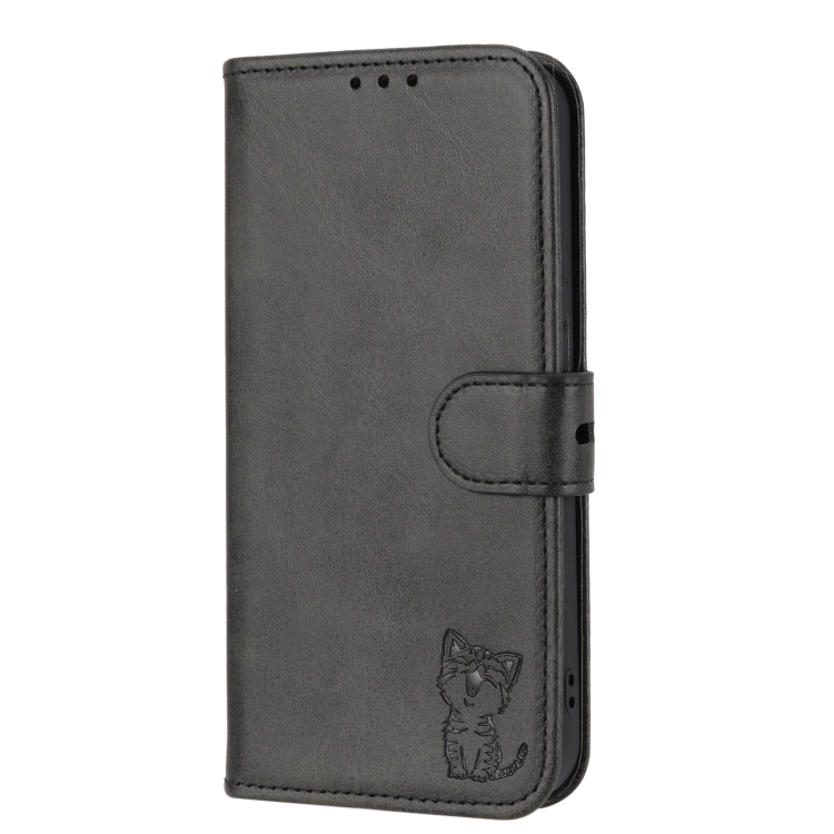 Funda de Cuero para iPhone 14 Happy Cat Pattern Flip en Relieve (Negro)