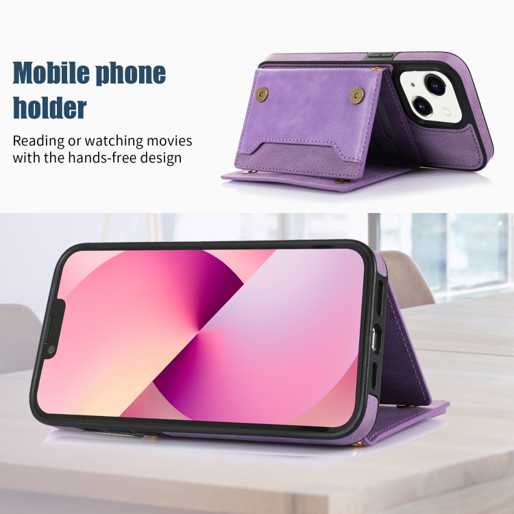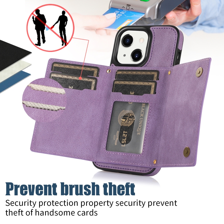 Estuche de Teléfono Cuero Rfid para iPhone 14 Tres Pliegues con Cordón (Púrpura)