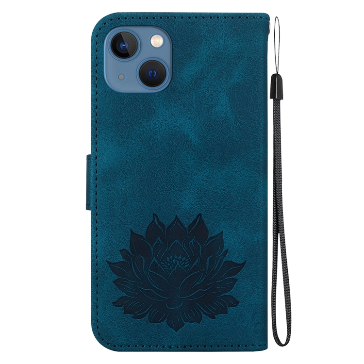 Funda de Cuero para iPhone 14 con Relieve de Loto (Azul Oscuro)