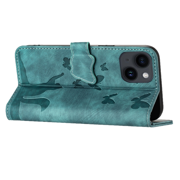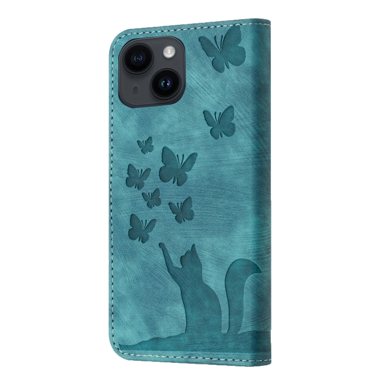 Funda de Cuero para iPhone 14 con Tapa y Estampado de Gato Mariposa (Wathet)