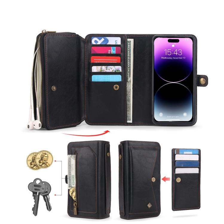 Funda para Teléfono iPhone 14 Cuero con Billetera y Cremallera Multifuncional (Negro)